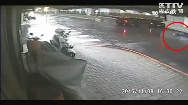 事發於8日下午4時許,監視器畫面顯示,砂石車當時在路口大迴轉,後方蔡姓騎士疑似打滑、高速撞上,直接犁田進車底,駕駛往前開沒多久發現不對勁,趕緊停車下來查看,所幸騎士沒有受困或被輾,好心路人幫忙報案扶人。警方到場進行酒測,2人皆無酒精反應,並將手腳、頭部挫傷的蔡男送醫救治。