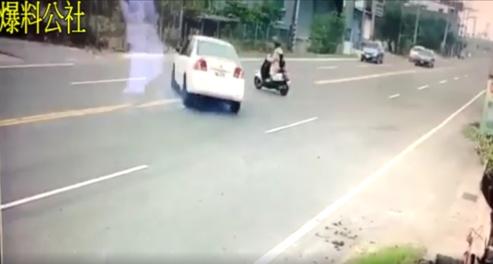極限甩尾!高雄白姓網友向臉書爆料公社私訊影片,在阿蓮區玉庫里的大馬路上,一位機車女騎士沒注意後方來車就迴轉,只見白色小客車差點撞上,駕駛緊急煞車外加超大甩尾,但仍是來不及,車體右側還是輕撞到女騎士,但也因此女子雖然倒地卻並未受到重傷,算是相當幸運。