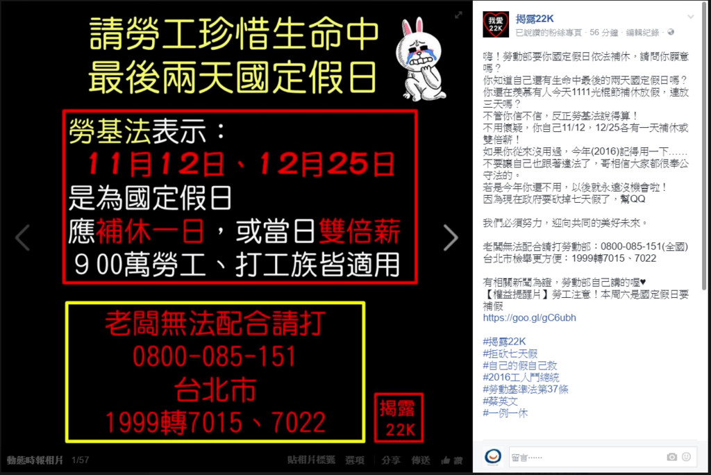 「揭露22K」表示,勞動部要你國定假日依法補休,「請問你願意嗎?」你知道自己還有生命中最後的兩天國定假日嗎?還在羨慕有人今天1111光棍節補休放假,連放三天嗎?「不管你信不信,反正勞基法說得算!」