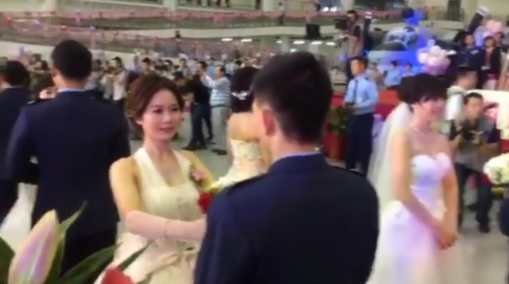 空軍司令部12日舉行盛大的聯合婚禮,118對新人齊聚空軍官校航空教育展示館,在司令沈一鳴以及數架戰機的見證下,完成難忘的終身大事,邁向人生的另一個里程碑。會場布置也擺脫過去國軍嚴肅、呆版又剛直的印象,在弟兄們精心布置之下,平常呆板單調的展示館充斥滿滿的粉色系幸福味;但有趣的是,國軍改不掉平常一個口令一個動作的習慣,婚禮過程仍聽從司儀號令動作,甚至緊貼褲縫等,讓人看了會心一笑。