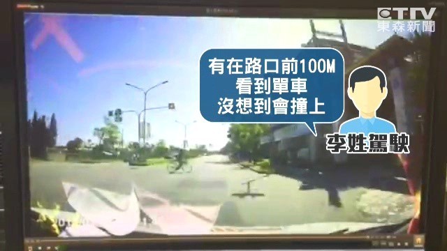 車禍前的畫面顯示,李男明明看到單車,卻依舊往前開,等到2車的距離非常接近,看到單車出現在自己正前方時,李男已經來不及煞車,強大的撞擊力道也讓單車的前輪噴飛,並且扭曲變形。