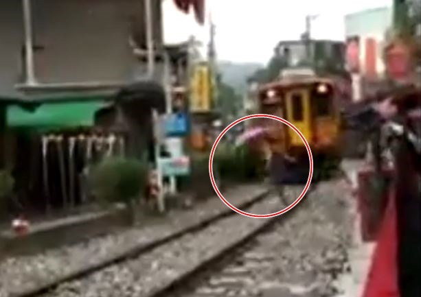 臉書粉絲團「爆料公社」15日下午分享一則貼文,指一列火車上午11時許正要進入新北市的時分車站,不料一名拿著粉紅色洋傘的婦人卻突然跨越鐵軌,嚇得司機趕緊鳴笛,旁邊的目擊者也放聲尖叫,以為就要發生意外。不過,這名婦人卻一派輕鬆,還使出「輕功水上飄」左蹦右跳,在最後一秒成功闖越鐵軌,令人相當傻眼。