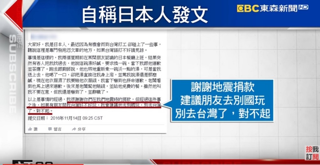 這名自稱是來台打工的日本網友,在該粉絲團匿名PO文寫道,在一間日本餐廳打工,遇上一個客人嫌湯太鹹要換一碗,答應並道歉後給廚師重做,「可是當我送上去,他喝了一口,卻把湯直接往我身上潑」, 還說湯還是很鹹,衣服弄濕了要賠償,老闆幫著道歉,「我還是嚇到了辭職了。」很謝謝你們在我們地震時的捐款,「但經過這件事之後,如果有朋友問我台灣好不好玩,我會建議他去別國玩,別去台灣了,對不起。」