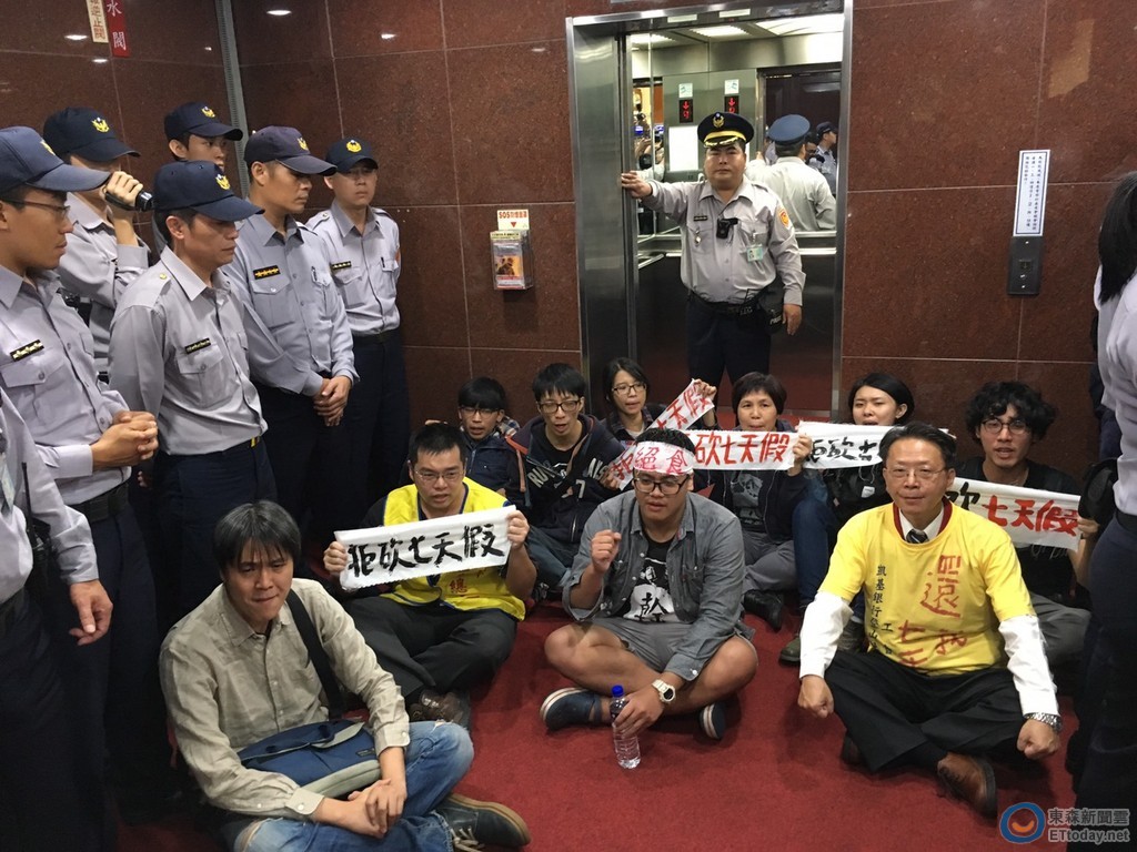 立法院16日舉辦攸關「一例一休」、「砍7天假」的《勞基法》修正案公聽會,勞團召委陳瑩不給其餘勞工進場旁聽,約12點休息時,勞團佔據群賢樓電梯口,不讓陳瑩下樓,大喊「拒絕橡皮圖章」、「假公聽、真砍假」、「柯建銘出來」。
