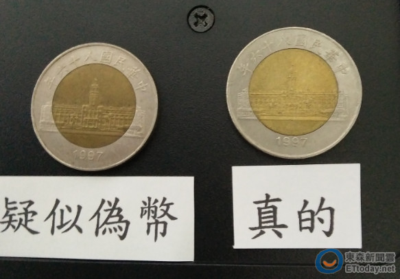 ▲將婦人的50元硬幣與銀行保存的舊款硬幣比,婦人的比較小,色澤中間深外圍淺。(圖/記者楊佩琪翻攝)