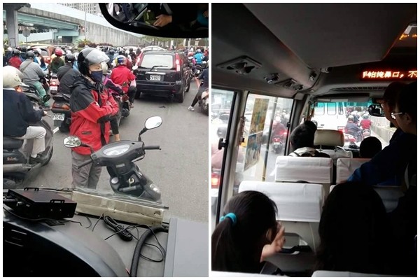 ▲公車疑似闖紅燈,騎士怒停路央肉身擋車。(圖/翻攝自我是中和人臉書社團/下同)
