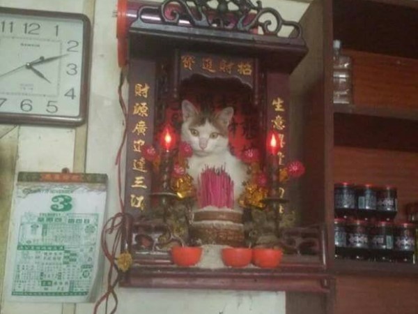 不少台灣人有拜神明和祖先的經驗,並且在家中會擺設「神明廳」或「公媽廳」,每天都會早晚三炷香祭拜。但最近有網友分享一張照片,指稱自己擺在牆上神明廳上,自己的愛貓竟然竟然就跳進去,而且乖乖地坐著。不少網友看到之後,有人以為是P圖的,也有人笑稱「財神貓快拜」。
