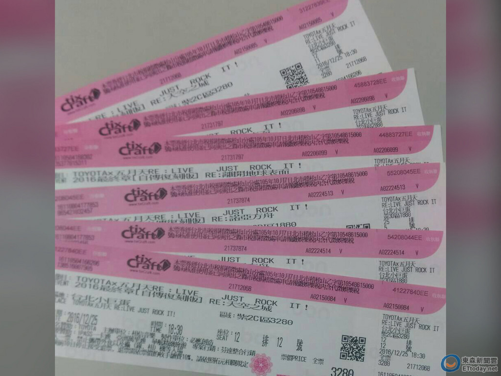 警方表示,30歲林姓女子在蝦皮拍賣上以「多張連號,五月天Re.Live Just Rock it!最終張」為名,販售3場共6張門票,原價應只有1萬6000元,卻以4萬1000元價格賣出。警方上門逮人時,林女供稱,這些票也是分別向其他3人買來。