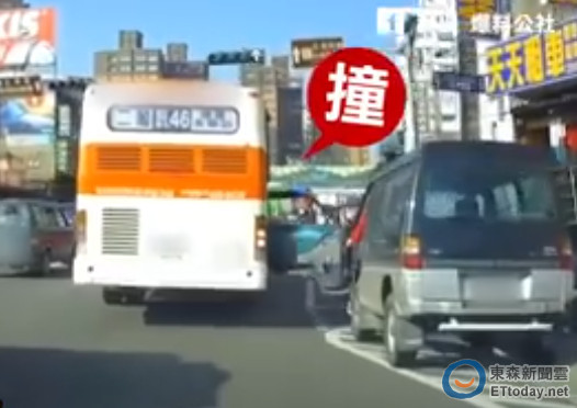 影片中可以看到,一輛公車在行經土城中央路上時,路邊一輛停在槽化線上的廂型車突然打開車門,公車來不及閃避,只能直接撞過去。只見廂型車車門被「開到最底」,玻璃也被撞掉,車主當下探出頭來,傻傻的看著公車,又看看門不知所措。後方車上駕駛也發出驚呼,「哇」