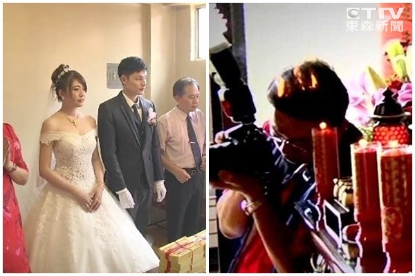 主人家歡天喜地辦喜事,為了留下感動畫面,一共請來2名攝影師,一人站一邊。不過,朱姓男子為了補捉完美鏡頭,整個人靠在供桌上,結果頭髮卻被蠟燭點燃,越燒越旺,他卻完全沒有感覺。