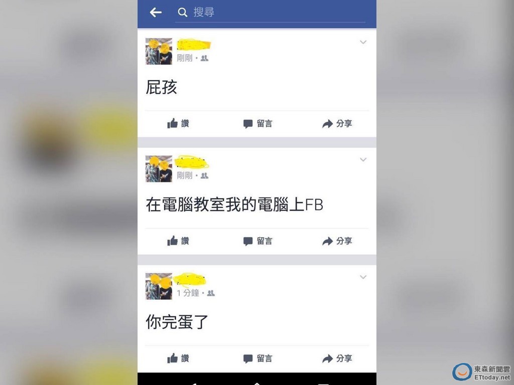 該名網友表示,「現在臉書十分方便,很多人都會在上面存取檔案。但是如果用了教授電腦還忘記登出的話....教授就會親自.....幫你po文。」沒想到教授所代po的3則貼文,分別是「屁孩。」「在電腦教室我的電腦上FB。」「你完蛋了。」最後底下留言還出現老師的女兒留言:「我爸要我代留言,你們下學期的實驗必然有精實的訓練和紮實的收穫。」