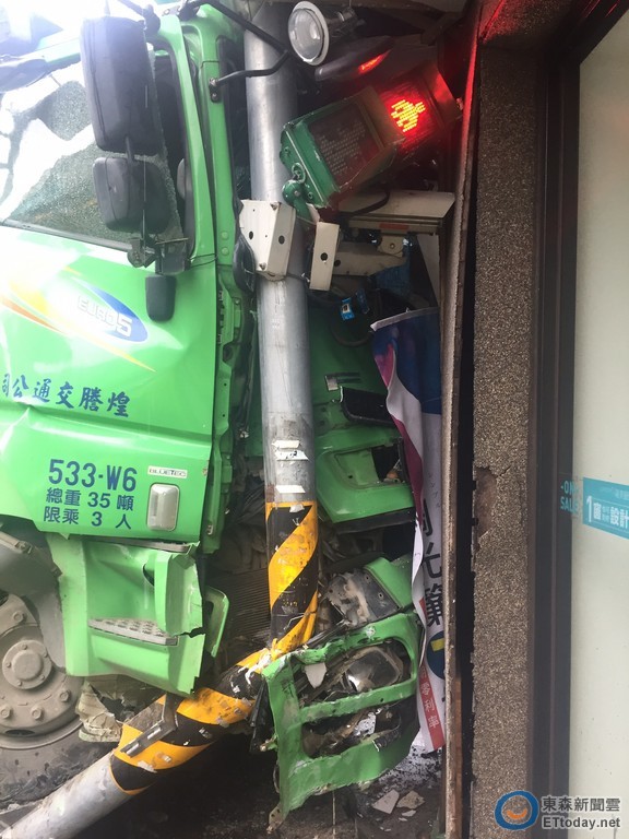 警方調查,許姓計程車駕駛(66歲)今日上午11時駕駛營小客,行經新北市汐止區中興路在到達工建路口時,直接要左轉工建路,但對向直行由江姓駕駛(40歲)所開的砂石車因煞車不及,只好偏轉車頭撞至民牆外面的號誌和監視器才停下來,幸未造成人員傷亡。