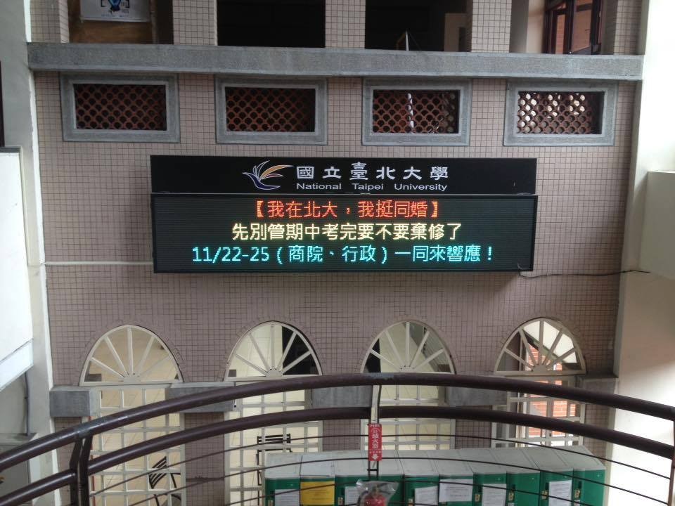 北大跑馬燈又出招了!台北大學跑馬燈曾在期中考前搭上「寶寶」、「藍瘦香菇」、「小熊」等時事梗,如今又搭上婚姻平權話題,在跑馬燈大咧咧的寫著「我在北大、我挺同婚」,下面一行則寫「先別管期中要不要棄修了」,引起網友一面倒支持。