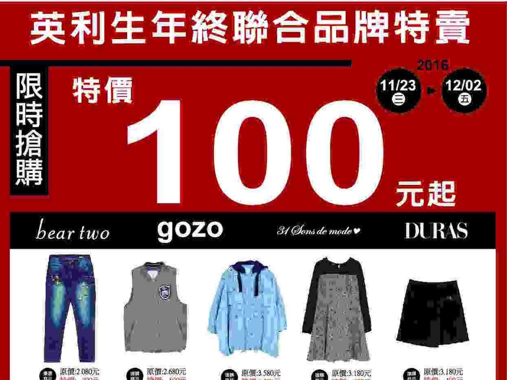 英利生集團集合旗下女裝品牌包括bear two、gozo、31 sons de mode、DURAS,推出2016年終聯合特賣1折起,現場還有每日一物大驚喜和限時搶拍活動,破盤價格最低一件只要100元起,結帳前打卡按讚還能現抵20元。現場提供購物袋及置物箱,折扣後金額滿3,000元以上即可刷卡。