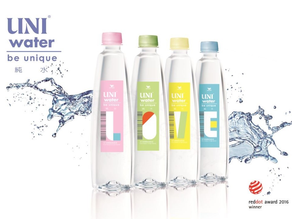 UNI water從2006年上市以來,主張「人生而獨特」,所以透過簡單俐落的六角瓶型,加上簡約的條碼設計,以及繽紛多彩的瓶蓋顏色,每一瓶都像是為了獨特而生。歷年來不斷推出季節流行色,2016年因應獨特而推出的字母瓶,讓每個人都可以用UNI water寫自己的故事,獲得消費者的喜愛,引發一股收集的風潮。