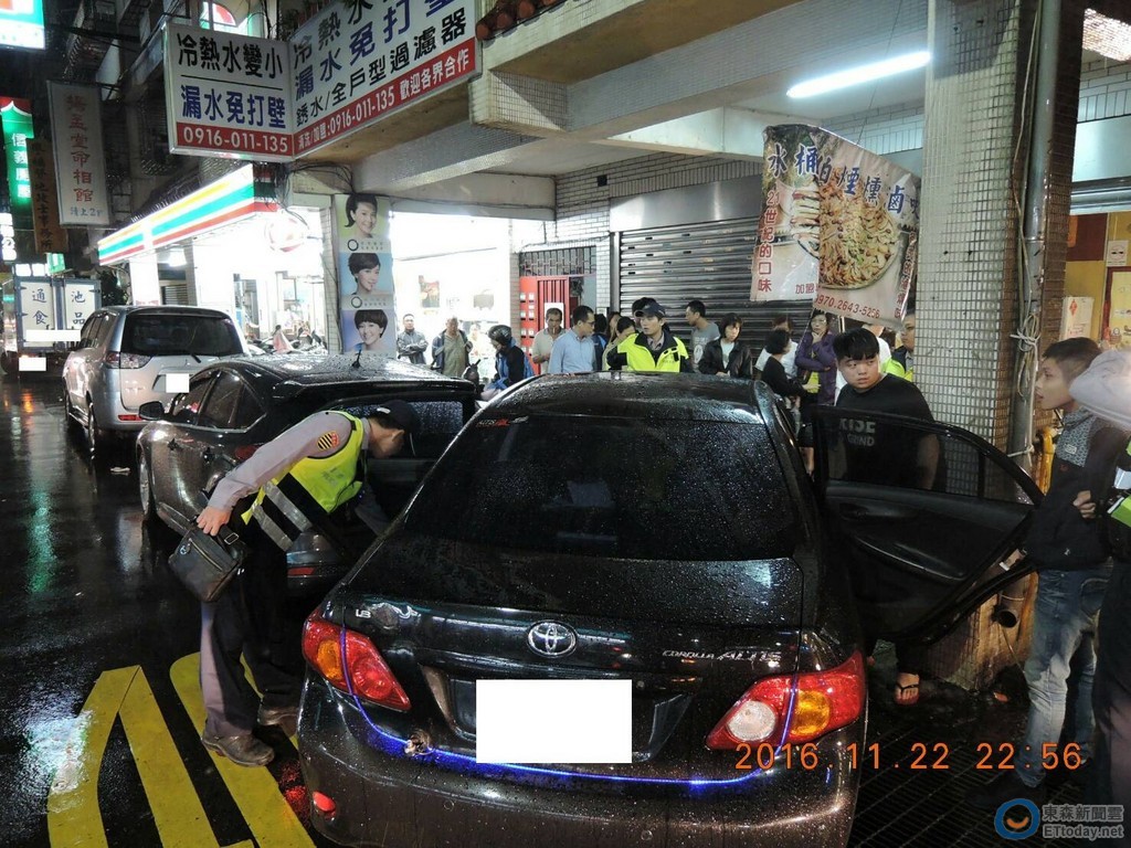 警方調查,林姓男子(22歲)22日晚上10時26分駕車沿汐止區建成路37巷往建成路方向右轉後直行,行至建成路35號前因天雨路滑失控而撞進一處早餐店,造成商家鐵門、攤販、停於路旁的1輛自小客車、2部機車受損。