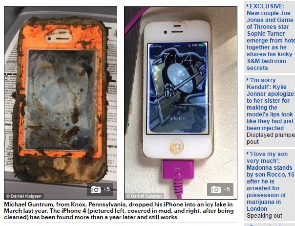 美國漁夫剛特朗(Michael Guntrum)去年3月為了抓魚,iPhone4不小心滑入結冰的湖中。沒想到一年過後,機械工程師卡格蘭(Daniel Kalgren)在乾涸的湖裡尋寶時,意外的發現這隻手機,而且竟然還能夠開機運作,也因此找到了手機原本的主人。