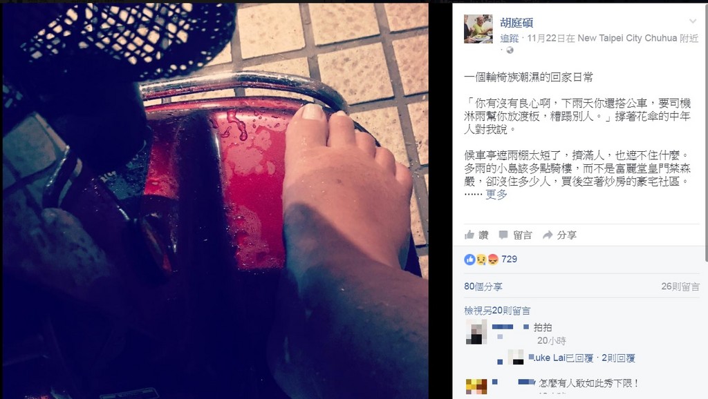 北部和東北部這幾天雨不斷,曾獲得總統教育獎的「漸凍人」胡庭碩日前在臉書發文,搭著輪椅手撐著傘,在候車亭遮雨棚等了30分鐘車,傘就那麼大,還是會被淋濕,遇上好心的司機來回移動車子,打開車門讓他能順利上車,還被一名中年人說,「你有沒有良心啊,下雨天你還搭公車,要司機淋雨幫你放渡板,糟蹋別人。」