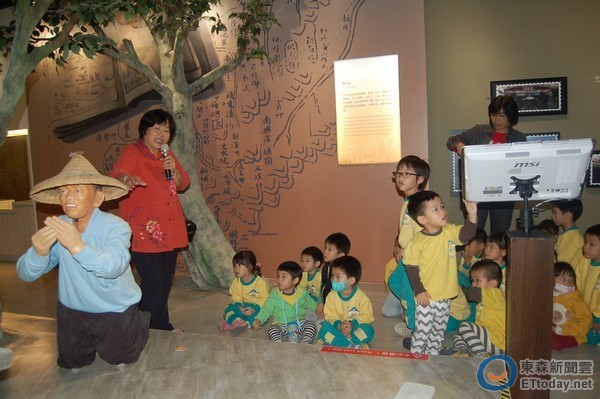 在2樓先民拓墾區,小朋友對福建、客家人拜拜土地公的仿真人像,感到非常好奇,導覽志工周繼鳳問,「這是真人還是假人?」「這是假人」大家異口同聲回答,顯得天真無邪又可愛。