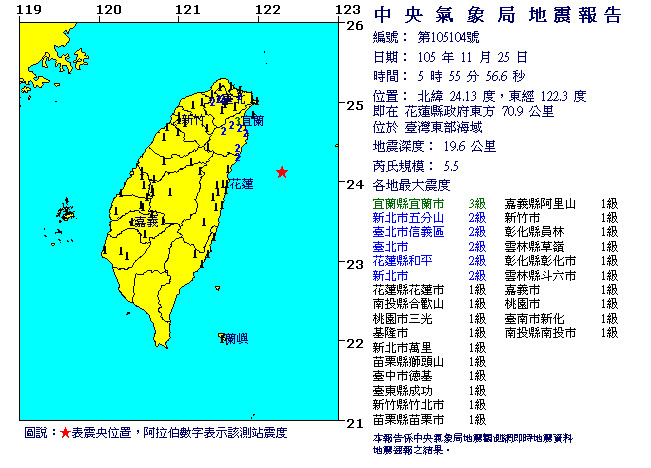 氣象局表示,今(25)日清晨5點55分台灣東部海域發生規模5.5有感地震,震央位在北緯24.13度,東經122.3度,也是花蓮縣政府東方70.9公里,深度為19.6公里。各地最大震度為宜蘭市3級、台北市、新北市、花蓮縣和平2級。