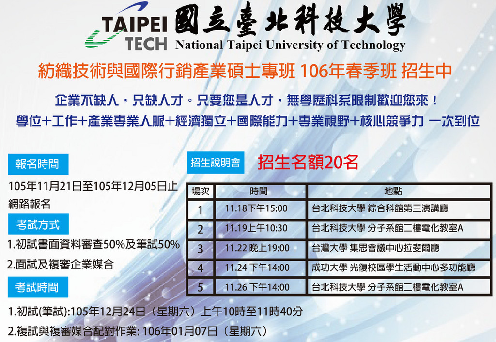 紡織業攜手北科大啟動「科技紡織國際人才培育計畫」,希望透結合創新、智慧穿戴、無毒環保、機能科技等新一代技術,呈現未來的成長動力。科技紡織產碩專班106年春季正式招生,除了企業會提供百萬獎學金,還會請50位產業老闆、主管授課,無學歷、科系限制都能報考。