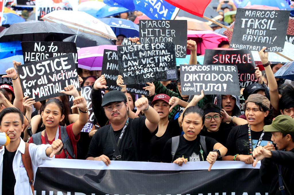 菲律賓上千位民眾聚在英雄墓園前,發起「黑色星期五」示威,抗議前總統馬可仕偷偷摸摸地下葬於英雄墓園,並且高舉馬可仕不是英雄的布條(Marcos is not a hero),強調馬可仕沒有資格下葬於於英雄墓園。