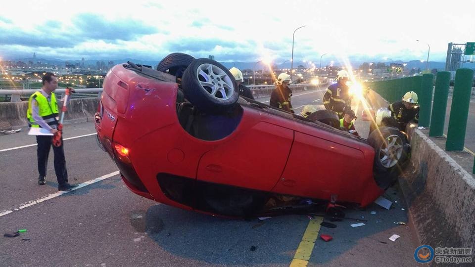 新北市三重區台64線往西成子寮出口路段,26日清晨5時58分發生車禍意外,一輛紅色三菱自小客車當場翻成「四輪朝天」,地上滿是碎玻璃、掉落的汽車零件以及雜物,撞擊力道之大連保險桿都噴飛。