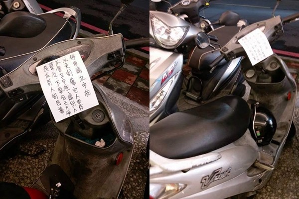 由於愛車遭刮傷,原PO憤怒地在該機車儀表板貼上紙條,「停車請立中柱,以免刮傷他人車體,不會立中柱,請別人幫忙,不要自己方便造成別人困擾!」