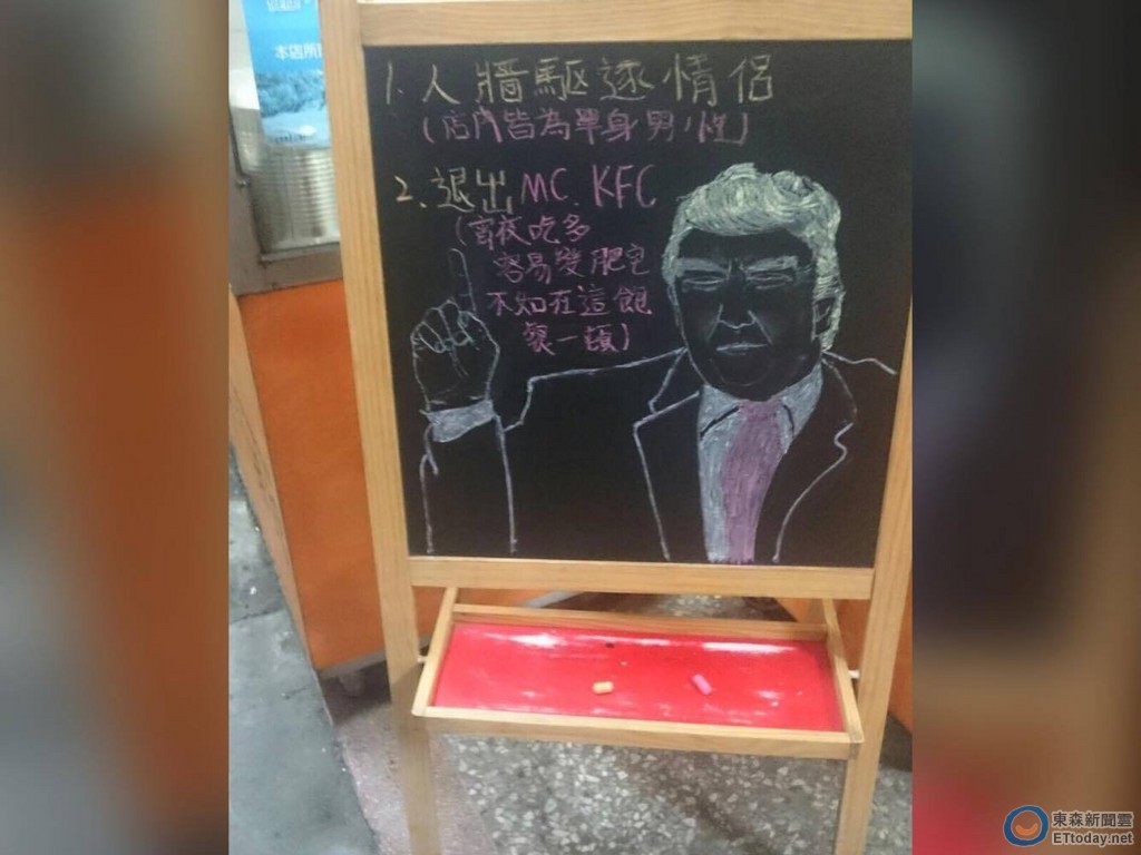 網友在「Dcard」上傳4張朋友的經典作品,包括台灣總統大選、PPAP、川普經典台詞、哈密瓜有一種哈味版本等,甚至還改寫他們的經典台詞。例如川普曾經說過要築起高牆趕墨西哥人,這位朋友則改寫成築起高牆要趕走情侶(因為店內都是單身男),讓許多經過的人停下腳步拍照留念。