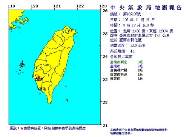 ▲地震資料。(圖/翻攝中央氣象局網站)生活中心/台北報導中央氣象局表示,28日上午8時17分,台南市新化區發生芮氏規模4.1地震,地震深度23公里,當地最大震度3級,台南市2級,嘉義縣六腳、高雄市1級。