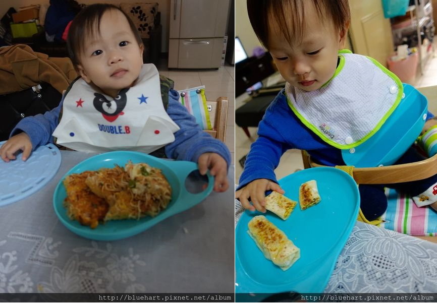 小子現在的午餐或早餐很常就是手指食物,晚餐跟我們一起吃(餐桌、地板還是一團亂),但有越來越好的趨勢,在他吃手指食物的時候,幾乎我都是一份跟他一模一樣的,陪他一起吃,除非食材真的不夠了!這是最快的陪吃方式,飽孩子也飽自已XDD