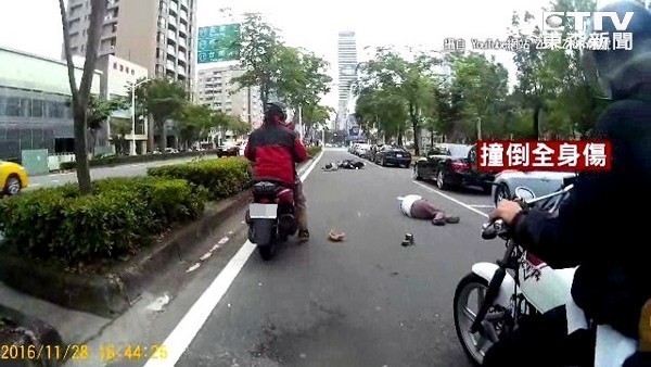 根據網友上傳的行車記錄器影片,28日下午4時44分,阿伯違規穿越中華三路,在慢車道和一名騎士相撞,兩人紛紛倒地,阿伯後來翻身,騎士則起身坐在地上。路過騎士連忙叫救護車。