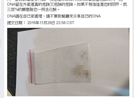 原PO還打趣地表示,她打算向在餐廳裡剪指甲的客人說,「現在是附含高科技的高智慧型犯罪時代,把DNA留在外面是真的危險又危險的危險。如果不相信這是您的指甲,我三百%的願意陪您一同去化驗」,且「DNA請在自己家處理,請不要到餐廳來分享自己的DNA」。