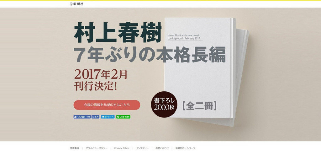 出版商「新潮社」周三宣布,村上的最新長篇小說將於明年2月在日本發行。村上的上一本長篇小說於2013年出版,這次他再度推出長篇小說, 讓他的粉絲興奮不已。