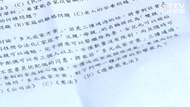 「請問『多元成家方案』對下列哪一種法律的影響最大?」答案很明顯就是《民法》,但題目敘述裡卻充滿老師對多元成家的誤解,而這樣的老師居然還在教公民課程,令家長不敢想像。