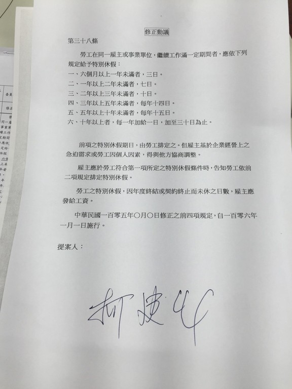 根據黨團提案,年資滿6個月、未滿1年者,就有3天特休假,做滿2年就增為10天,滿3年有14天,滿5年就有15天,10年以上者則每年加給1日,最高可到30天。
