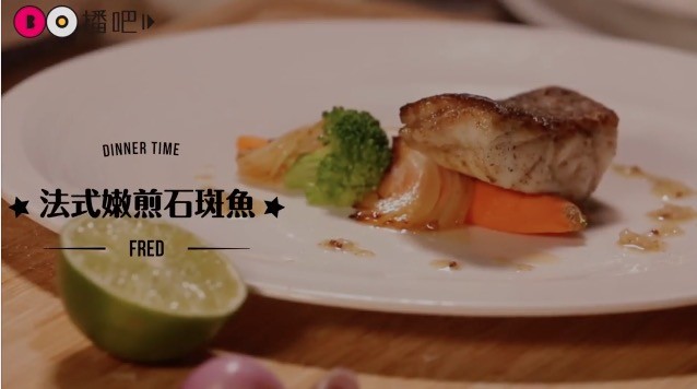 首先,Fred簡單去除魚肉身上多餘的刺,再切掉肉薄的尾段,只取用中間一段,並且在魚背畫上幾刀,之後灑上麵粉以增加脆度,再加一點鹽巴;開火後,先放入奶油,再把魚肉下鍋,而為了讓魚皮有酥脆感,煎魚時需按壓讓它平均受熱,不用急著翻面;待翻面時,要先開大火把表面封汁,再轉小火讓魚肉裡面熟成,利用兩段式火候烹飪出石斑魚彈性紮實、酥脆的不同口感。