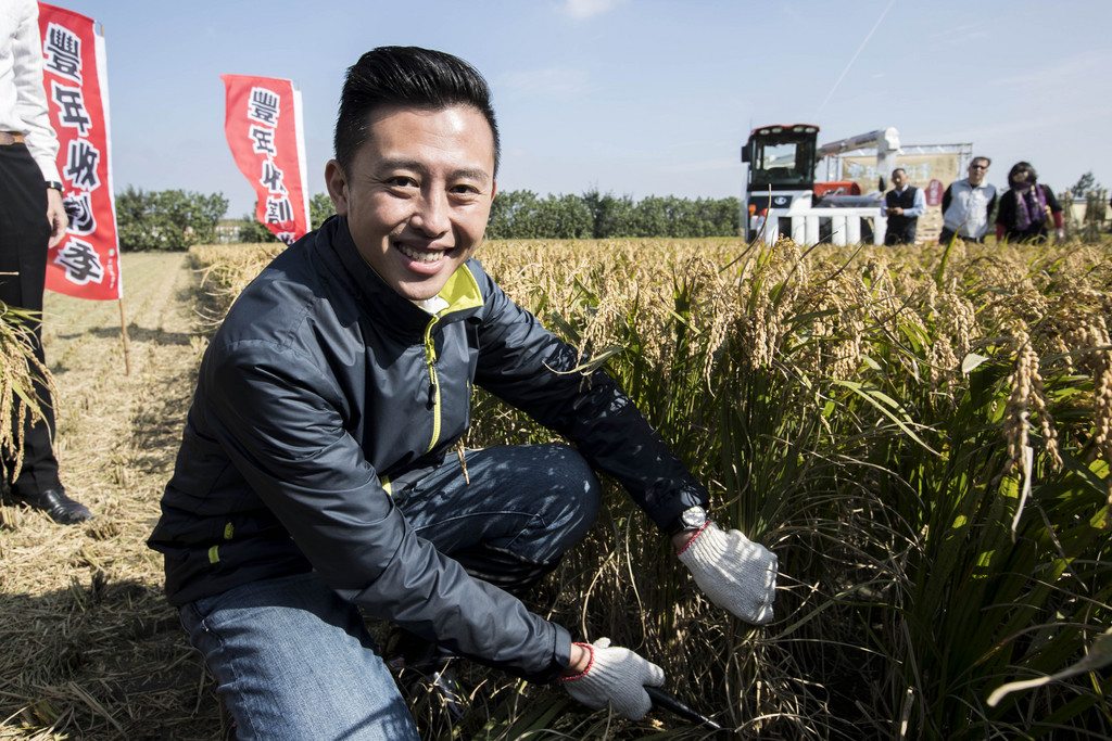 ▲新竹市長林智堅換上雨鞋,拿起鐮刀體驗割稻、碾米,推廣新竹「好香米」。