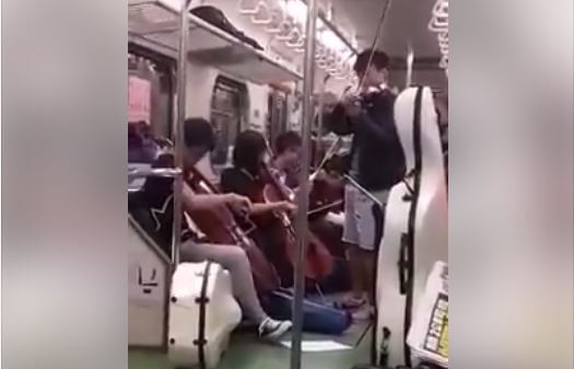 ▲弦樂團在區間車上即興演奏《女人香》,讓女網友相當驚豔。(圖/翻攝自爆料公社)
