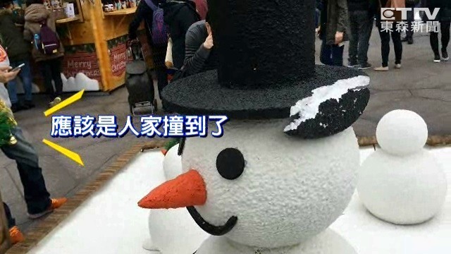 市集的可愛雪人讓許多小朋友忍不住摸了一下,但仔細一看雪人的手已經成了斷掌,另外一個戴帽雪人黑帽子也斷了一邊,聖誕市集才第二天,現場就已經出現許多損毀,連工作人員一時也沒注意到「應該不太可能吧,我去看一下...應該是人家撞到了」,原來民眾擠在廣場拍照,就算上面標示禁止踏坐,還是有很多人無視規定,就算工作人員勸離後,沒多久又來新的民眾違規,怎麼防也防不住。