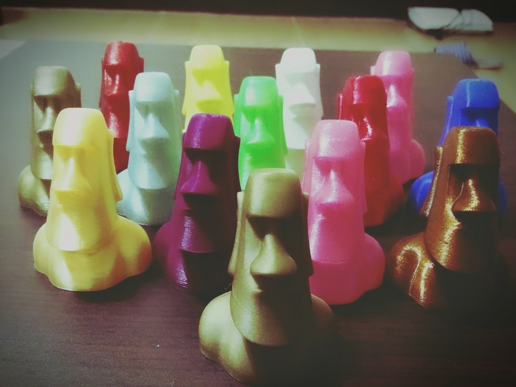 原PO表示,當下看到真的覺得狂跩酷炫屌炸天,歡喜之情表露無遺,而老婆也露出笑容!沒想到過幾天後,老婆竟然帶回14座五顏六色的小摩艾3D列印,整整有14座,一字排開讓他驚呆,直呼「妳幹嘛啦……。」