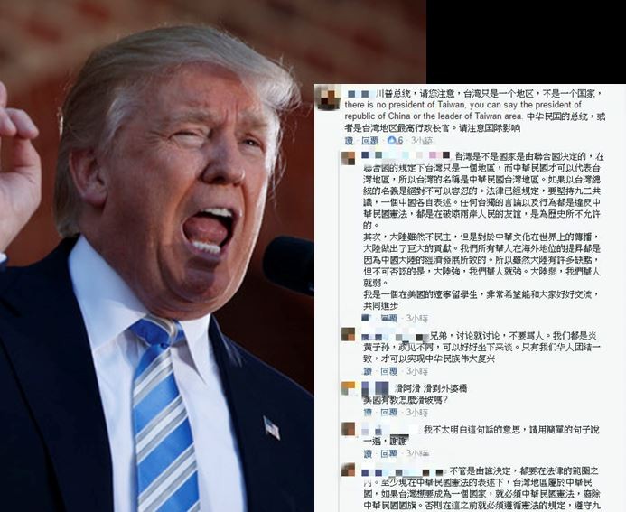 總統蔡英文和美國總統當選人川普12月3日上午通話10分鐘,事後川普在推特及臉書上發文表示,「台灣總統今天打電話恭喜我選上總統!」沒想到竟有許多對岸網友特別到川普的臉書大罵,並在台灣網友「感謝川普總統」的留言下方嗆聲。