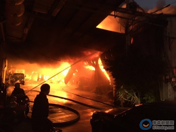 由於周遭皆為連棟鐵皮工廠,火勢一路接連延燒不止,加上廠內大量木製棧板及易燃物讓火勢控制不易,更不時傳出爆炸聲及巨大火球,大量濃煙讓天空整片染黑。就在大火足足燒了4小時後,消防隊出動怪手以拆除廠房方式,協助滅火。