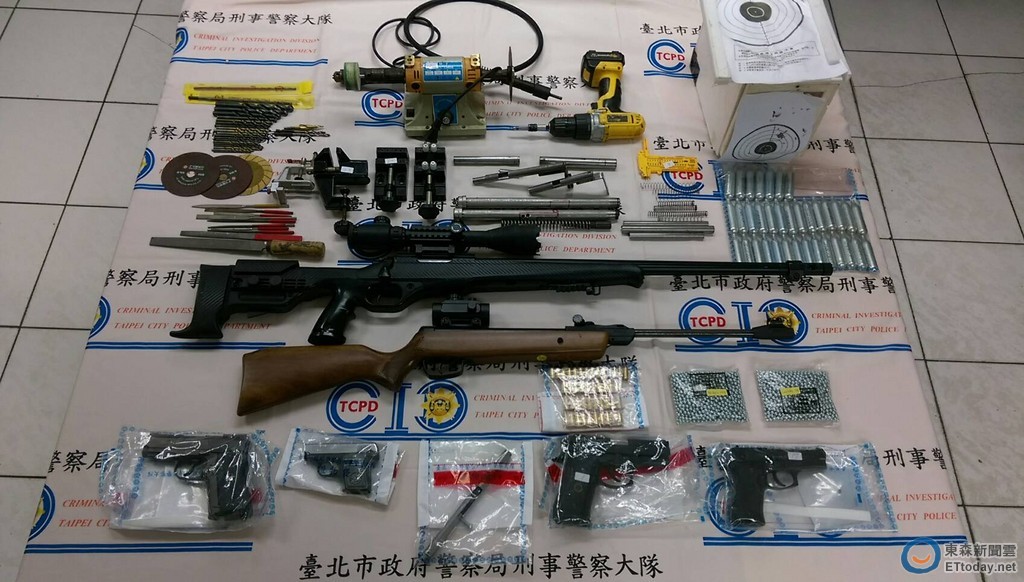 台北市刑大員警日前接獲線報,陳姓男子擁槍自重,家中猶如小型軍火庫,更是改槍專家。日前,員警前往陳男位在淡海新市鎮的景觀豪宅搜索,果真找到金牛座、華山改造手槍各1支;彈夾2個、子彈44顆;短空氣槍2支、長空氣槍2支;鋼管槍1支、半成品5組;砂輪機1組、固定夾4組、電鑽1枝、鑽頭24枝、鋼管3枝、瓦斯鋼瓶35枝、鋼珠2包等等各式改槍工具。