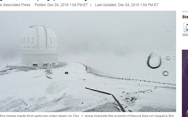 據悉,美國國家氣象局近日針對夏威夷地區發布冬季風暴警告,在島上低海拔地區開始出現降雪,讓當地居民感到驚訝。而在海拔4207公尺的毛納基火山及海拔4169公尺的冒納羅亞火山頂,也在當地時間3日晚上出現積雪高達60公分。