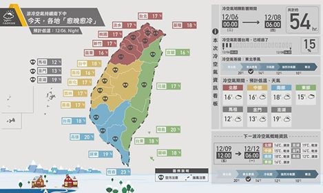 「天氣即時預報」表示,本次涼冷空氣報到,今晚各地就會有第一波低溫,且各地會愈晚愈冷,冷空氣期間預計自6日影響至8日清晨,各地低溫北部為16度、中部16度、南部18度、東部15度,不過下一波冷空氣,將在週五(9日)午後再度報到。