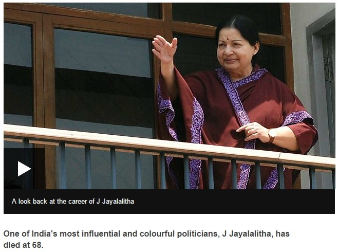 根據《英國廣播公司》報導,坦米爾納德邦68歲的首長賈亞拉莉塔於4日心臟病發入院,搶救至5日不治,當局將她的遺體覆蓋國旗送到了市政廳,象徵最高榮譽,同時宣布12月6日為國定假日用以紀念她。