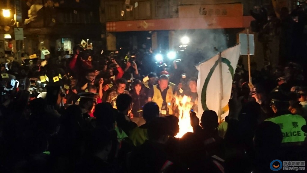 《勞基法》修法協商沒結果,國民黨團、民進黨團在立法院內爆發激烈衝突,立法院長蘇嘉全則宣布表決,並順利通過,將延長開會時間至勞基法處理完畢為止。場外勞團大為不滿,隨即展開攻勢,先是拋擲煙霧彈,接著開始撒、焚燒冥紙與「點亮台灣」旗幟,警方則在一旁忙著倒水滅火。