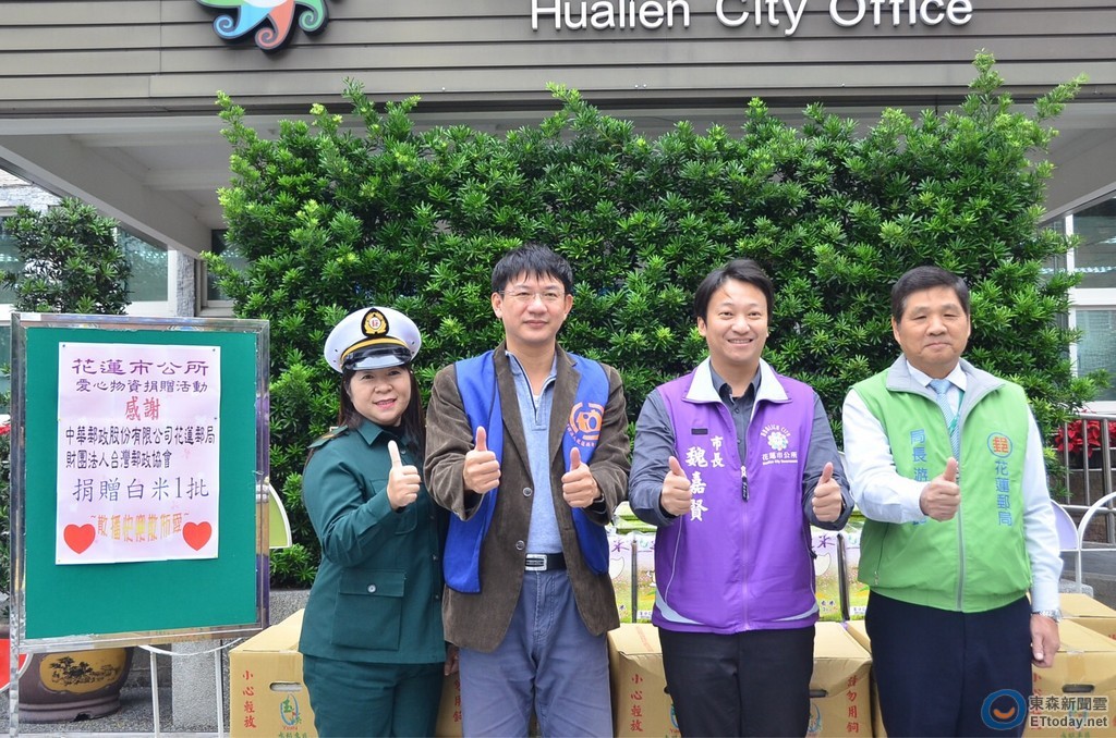 台灣郵政協會及花蓮郵局6日在局長游仁崑的帶領下,前往花蓮市公所捐贈700公斤白米,市長魏嘉賢回贈感謝狀,並隨即將其中600公斤的米轉贈給老人暨家庭關懷協會,委由該會轉送到需要的獨居長者家中。