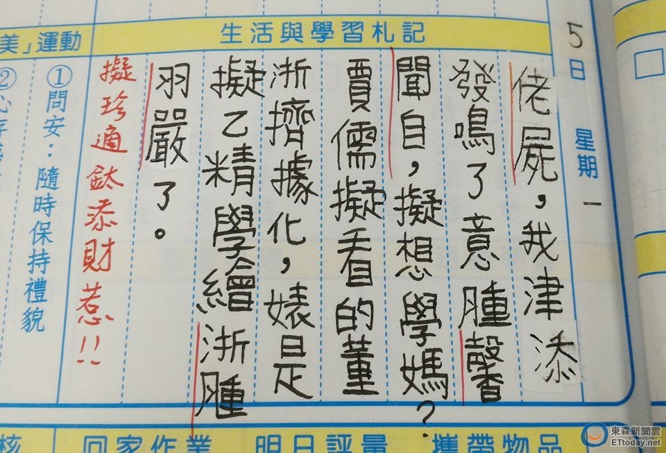 現在小孩古靈精怪、花招百出,讓老師們哭笑不得阿!擔任國二班級導師的陳冠中在臉書分享,學生寫在聯絡簿上的生活札記,只見內容是中文字沒錯,不過將原本詞語全替換成諧音字;而班導也很配合,用同樣的方式回應道,「擬珍適鈦添財惹」。